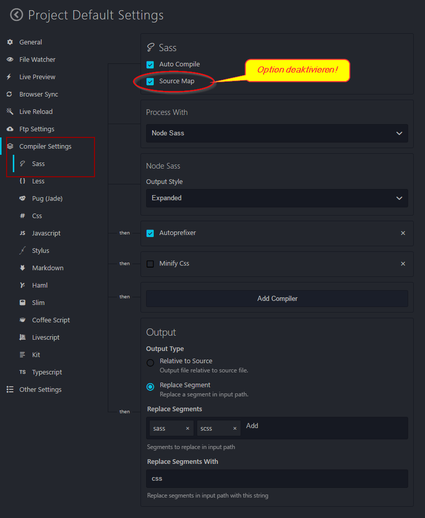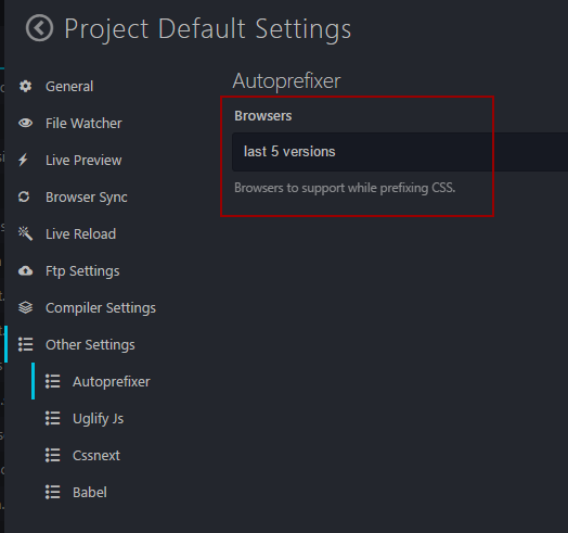 Alle anderen Optionen können wie original konfiguriert beiben (siehe Bild) - Other Settings > Autoprefixer: