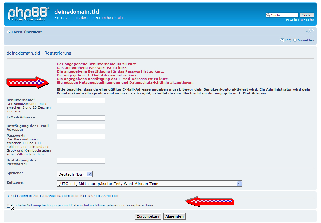 'TERMS_CHECK' => 'Ich habe die <a href="ucp.php?mode=terms">Nutzungsbedingungen</a> und die <a href="ucp.php?mode=privacy">Datenschutzrichtlinie</a> gelesen und akzeptiere diese.',