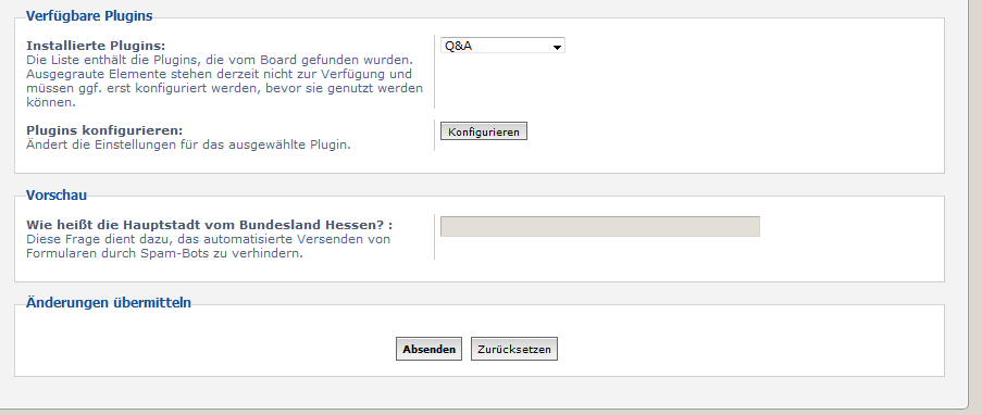 In diesem Beitrag zum Spamschutz https://www.phpbb.de/kb/spamschutz wird das Einrichten des Q&A Captcha beschrieben. Entsprechend habe ich auf "Konfigurieren" geklickt und 7 Fragen in Deutsch mit entsprechenden Antworten eingestellt. Die Fragen wurden übernommen. In der Anleitung steht folgendes: Zur ausgewählten Standard-Sprache muss mindestens eine Frage erstellt werden, sonst wird Q&A nicht als aktives Captcha-Modul ausgewählt! Tatsache ist aber, dass das Q&A nicht aktiv wird. Wähle ich Q&A erneut aus und klicke auf "Konfigurieren",dann sind die Fragen sind noch da.