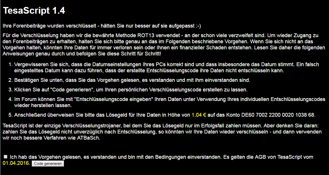 Auch wenn es hier nur ein Scherz war - steckt doch ein ernster Hintergrund hinter der Sache: in letzter Zeit greifen die Erpressungstrojaner (auch Ransomware) massiv um sich. Wenn die Entwickler keine gravierenden Fehler gemacht haben, sind die Lösegeldforderungen allerdings deutlich höher als bei unserem TesaScript und die Chance auf eine einfache Entschlüsselung deutlich geringer. Achtet also darauf, dass ihr keine unbekannten Dateien öffnet, sichert eure Daten regelmäßig und bewahrt sie an einem sicheren und normalerweise nicht online erreichbaren Ort auf. Auch wenn bislang primär PCs im Fokus der Trojaner stehen, gibt es keine Garantie, dass nicht auch Angriffe auf Websites versucht werden - die Vorsichtsmaßnahmen gelten also auch für Euer Forum. Mehr Infos zum Thema gibt es z. B. unter: http://www.heise.de/thema/Ransomware