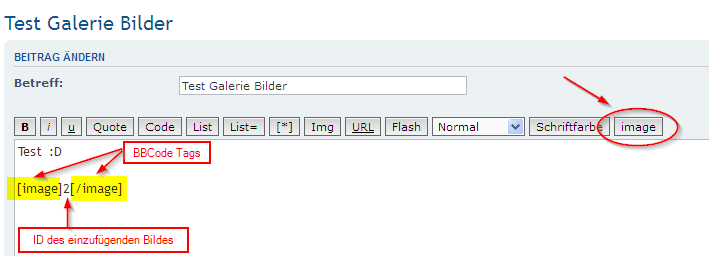 Bei der Installation wird ein neuer BBCode eingerichtet, über den Du beim Erstellen eines Beitrags in diesem ein Bild aus der Galerie anzeigen lassen kannst: