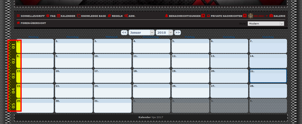 Ich wollte den angepassten Kalendercode für meinen Style Modern in meinem Forum einfügen. Hab alles nochmals kontrolliert. Dabei ist mir aufgefallen, dass keine Wochenzahlen mehr angezeigt werden links. In der Ext css ist es immer noch eingefügt.