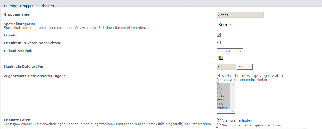 Hast du denn die Datei-Endungen für Videos im ACP unter "Beiträge -> Dateianhang-Konfiguration -> Dateitypen verwalten" und "...... -> Dateityp-Gruppen verwalten" eingerichtet?