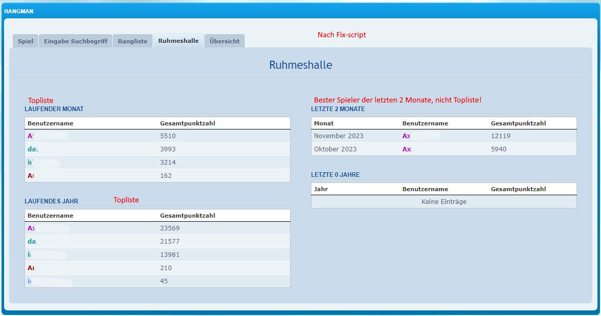Ja richtig. Ist wieder befüllt. Dabei fällt mir (erstmalig) auf, dass in den letzten zwei Monaten nur der Spieler mit den höchsten Punkten einzeln steht, dies also keine Topliste ist. Da täuscht das Wording. Oder war das vorher anders? So lange haben wir die Ruhmeshalle ja noch nicht.