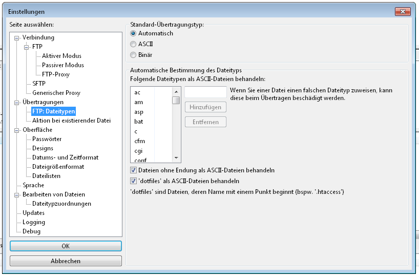 - Einstellung: Bearbeiten > Einstellungen > Übertragungen > FTP: Dateitypen > Standard-Übertragungstyp: Binär