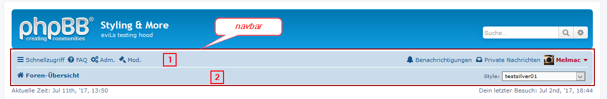 Da ich hier keine Möglichkeit finde, dir einen Vorschlag für die Änderung der navbar_header.html und overall_header.html (Codes teils zu lang (Knigge)) und zeitlich unbefristete Codierungen per Pastebin nicht möglich sind, habe ich dir eine PN mit einem Archiv zukommen lassen, worin du TXT-Files findest, die du in einem jungfräulichen Prosilver ausprobieren kannst.
