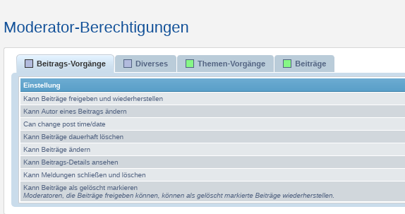 "Kann Beiträge dauerhaft löschen" würde ich immer auf "Nie" setzen, wenn du eine lückenlose Dokumentation willst. Ansonsten kann der Moderator beim Löschen entscheiden, ob der Post dauerhaft gelöscht wird oder nur unsichtbar wird.