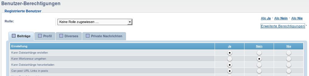 Schau es dir nochmal an, aber denk daran, dass alle deiner Benutzer immer in der Gruppe "Registrierte Benutzer" sind, es also falsch wäre, für diese Gruppe ein "nie" zu setzen. Besser ein "nein" und für die anderen Gruppen (Moderatoren etc.) ein "ja"