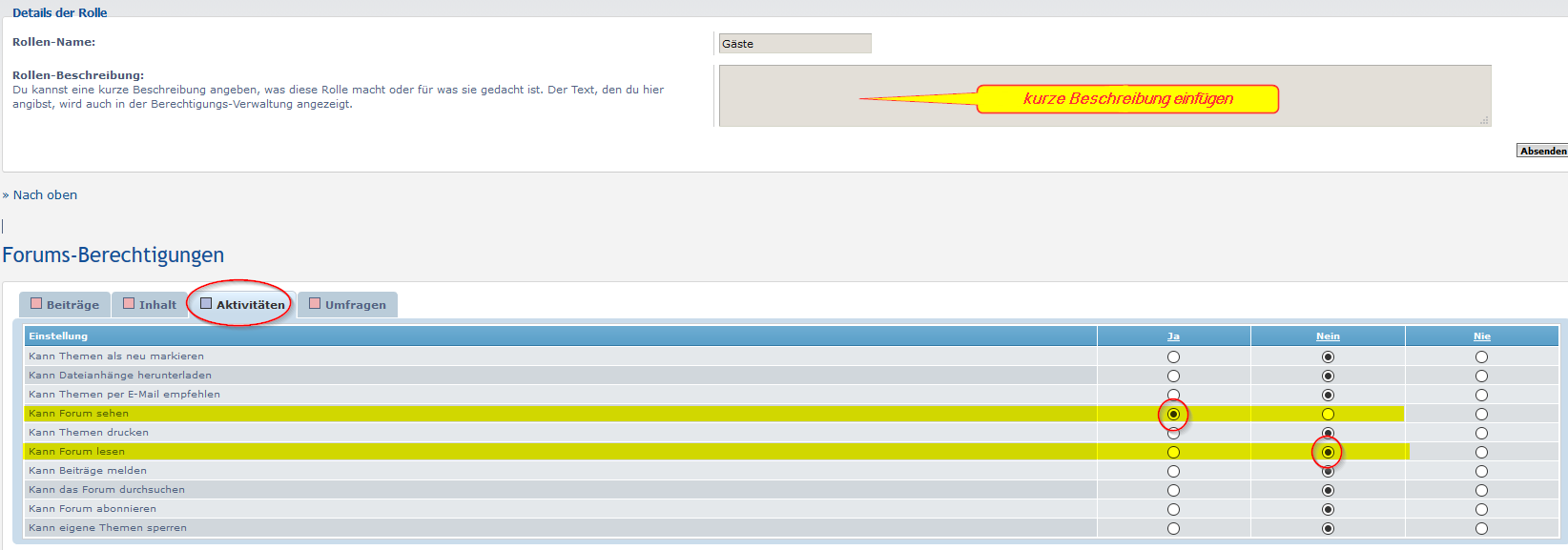 Jetzt kannst Du die Zugriffsrechte für die Gästegruppe einfach dadurch ändern, dass Du eine vordefiniert Rolle zuweist - ansonsten müsstest Du eine "nicht ganz passende" wählen und die für jede Kategorie/jedes Forum einzeln anpassen :wink:
