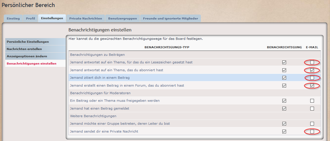 Für alle anderen möglichen Vorgänge musst Du dies erst noch im persönlichen Bereich im Tab "Einstellungen" unter "Benachrichtigungen einstellen" aktivieren: einfach bei jeder Option, für die Du eine Benachrichtigung auch per Mail bekommen möchtest, einen Haken bei "E-Mail" setzen.