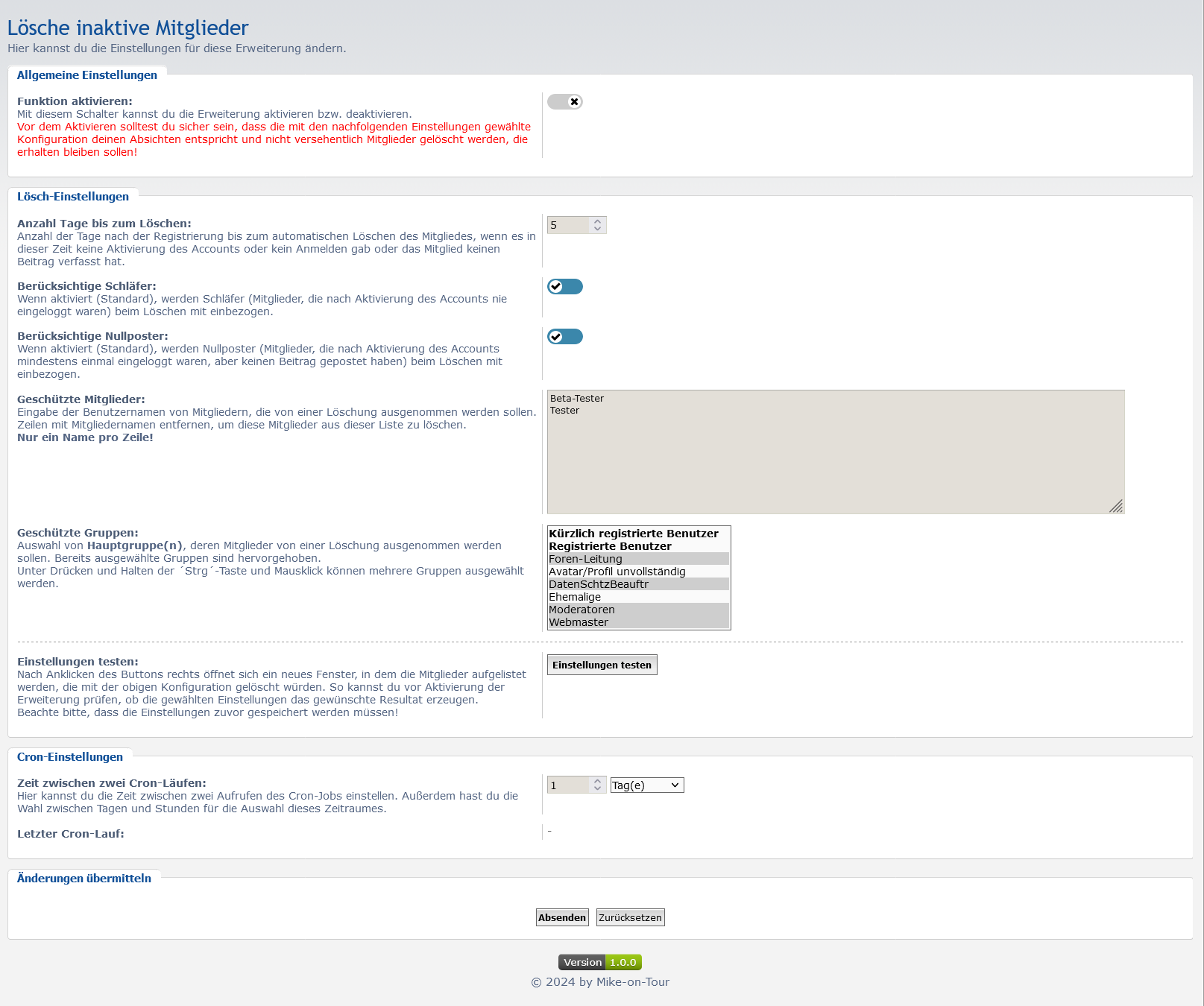 Diese Erweiterung ermöglicht es dem Administrator, automatisch alle Mitglieder zu löschen, die entweder ihren Account nicht aktiviert haben (Inaktive) oder nach Aktivierung nie eingeloggt waren (Schläfer) oder eingeloggt waren, aber nie einen Beitrag geschrieben haben (Nullposter).