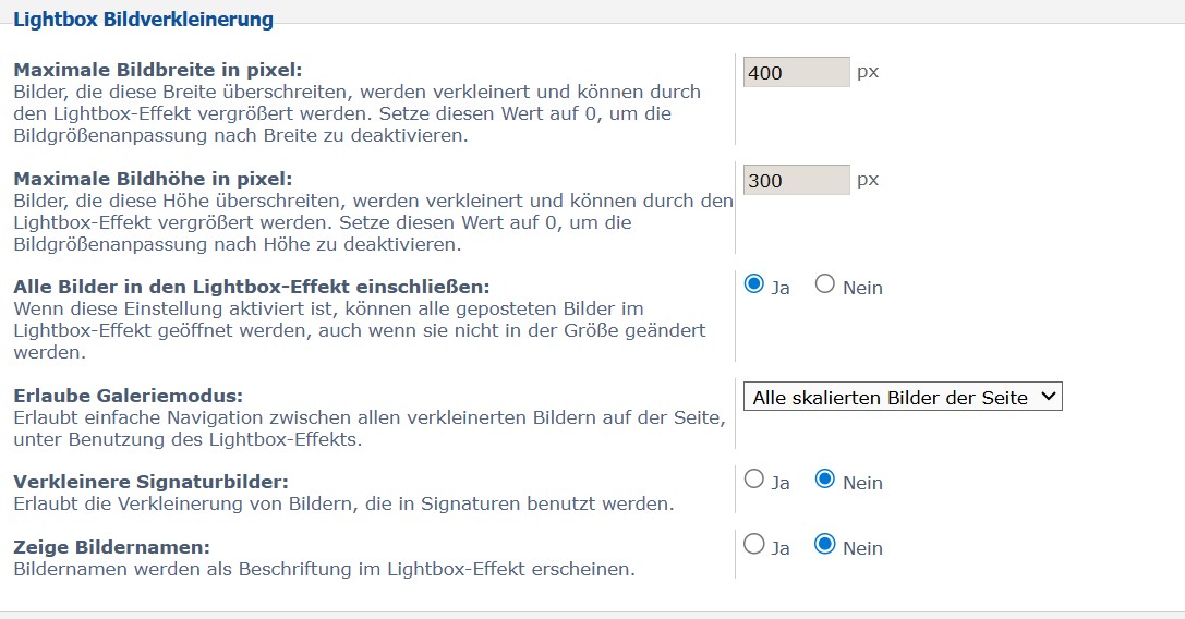 Die Bilder aus dem Forum öffnen sich im Browserfenster und nicht als Lightbox. Die Extension scheint aber zu funktionieren, denn wenn ich die Größen ändere reagieren die Thumbnails im Thread.
